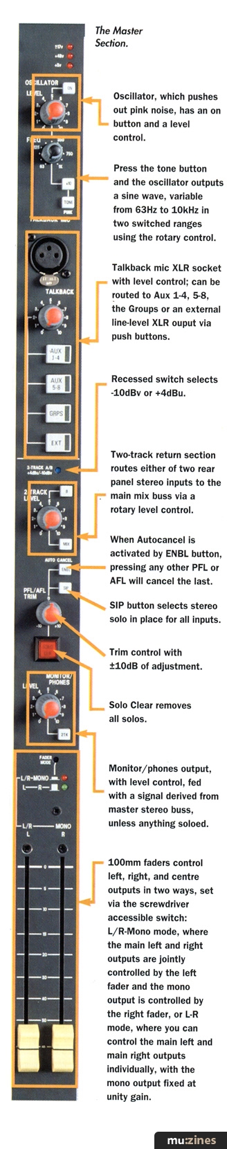 The remaining outputs and inputs include two stereo balanced tape returns, switched between A or B and feeding the main Mix buss, after the fader, via a rotary level control. A recessed switch selects -10dBV or +4dBu operating levels; this is useful when setting up the desk discretely while background music or other activities (if a separate desk is inputted here) continue through the speaker system. The tape inputs bypass the mix insert points, but appear on the Matrix. A stereo headphone output is fitted at the front of the console, under the armrest (headrest?) and monitors any solo'd section or Mix output. The same appears on the monitor output on the back panel; useful if you are using delayed, nearfield monitors on top of the desk.