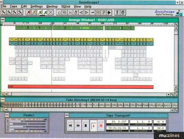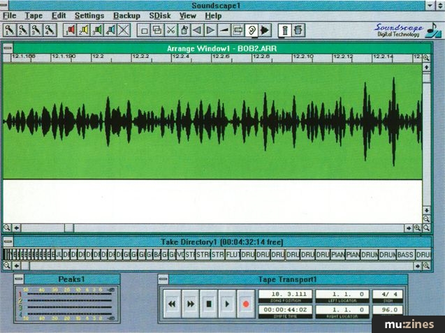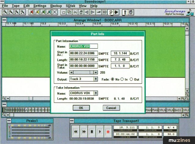 As I have already intimated, use of the Soundscape software is nothing if not logical and straightforward. Songs are created in an arrange window (similar to Cubase), which takes up most of the screen. Each song consists of a series of musical 'parts' which play the actual recorded audio 'takes' on disk. For instance, you might record the chorus of a song, and this would be saved on disk as a take. This might then be used four times within an arrangement, and each occurrence would be called a part.