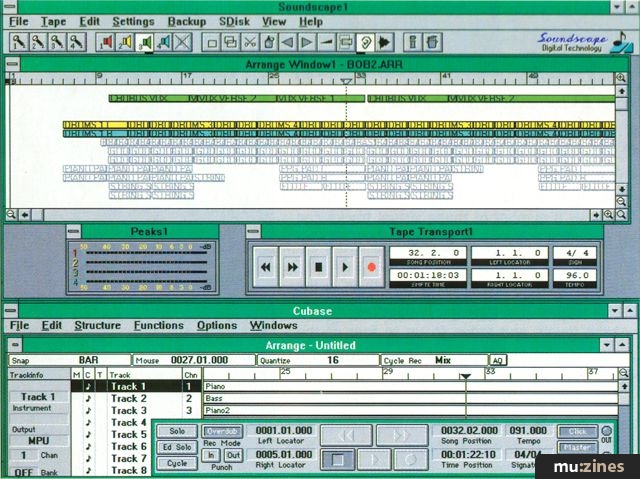 Synchronising Soundscape to a standard MIDI sequencer is possible via MTC in master or slave modes, or via MIDI Song Position Pointers with MIDI clocks as a master. Physically, all that is required is a MIDI lead from the Soundscape rack unit to the standard PC MIDI interface used by the sequencer. SoundScape's MIDI input provides full merging of all messages - including System Exclusive - so that when using Soundscape as the master, recording of MIDI into the sequencer is performed via the Soundscape MIDI input. Any Windows-based sequencer such as Cubase, Cadenza or Cakewalk can run on-screen alongside Soundscape, and the displays and time readouts will remain locked as you move around your song.