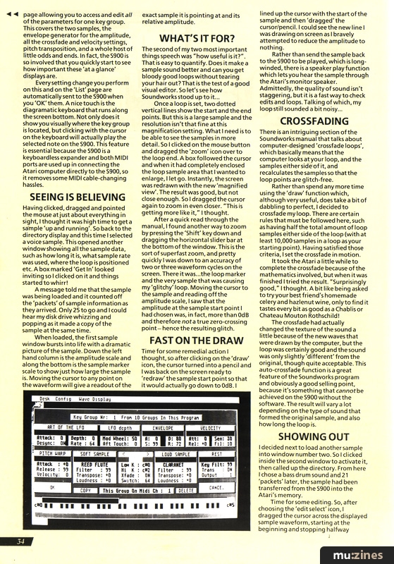 Is it easy to operate? All I can say to that is: "Is the Pope Polish?" Because of the Atari's marvellous graphics environment and mouse, everything on the Soundworks visual editor is rodent-orientated and thus easy to get at and use. A click here, a drag there, and without any real computing knowledge you can quickly get to grips with any S900 sample you care to name.