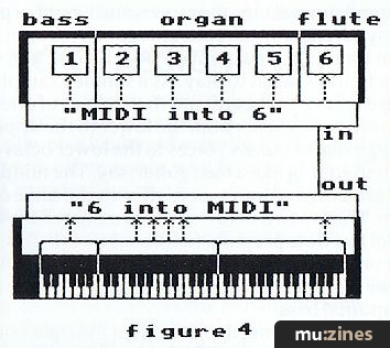 Now I could arrange for 6 separate MIDI links (6 Outs on the keyboard, 6 cables, 6 Ins on the expander and possibly 6 Thrus as well) but that would be expensive and wasteful. After all, I've got 16 channels available using MIDI so why not use a separate channel for each control flow! This is shown in Figure 4 where all 6 control flows merge into one MIDI connection. At the expander end, the 6 control flows are separated and sent to the relevant voice circuit according to their MIDI channel numbers. We now know enough to describe MONO mode!