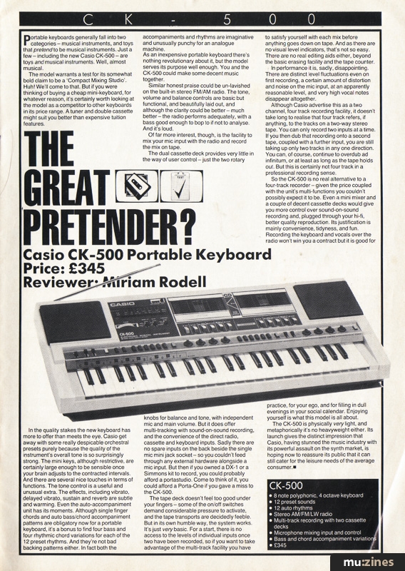 The CK-500 is physically very light, and metaphorically it's no heavyweight either. Its launch gives the distinct impression that Casio, having stunned the music industry with its powerful assault on the synth market, is hoping now to reassure its public that it can still cater for the leisure needs of the average consumer.
