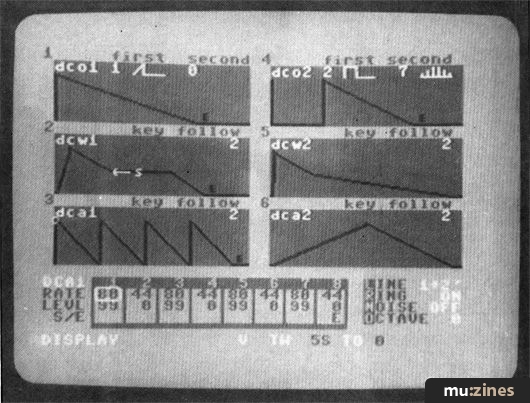 Envelopes for DCO 1 and 2, DCW 1 and 2 and DCA 1 and 2 are displayed graphically with values listed underneath, and all values are changed using the computer keyboard. Key follow and waveshape values are shown together with a little diagram of the wave shape for each oscillator bank.