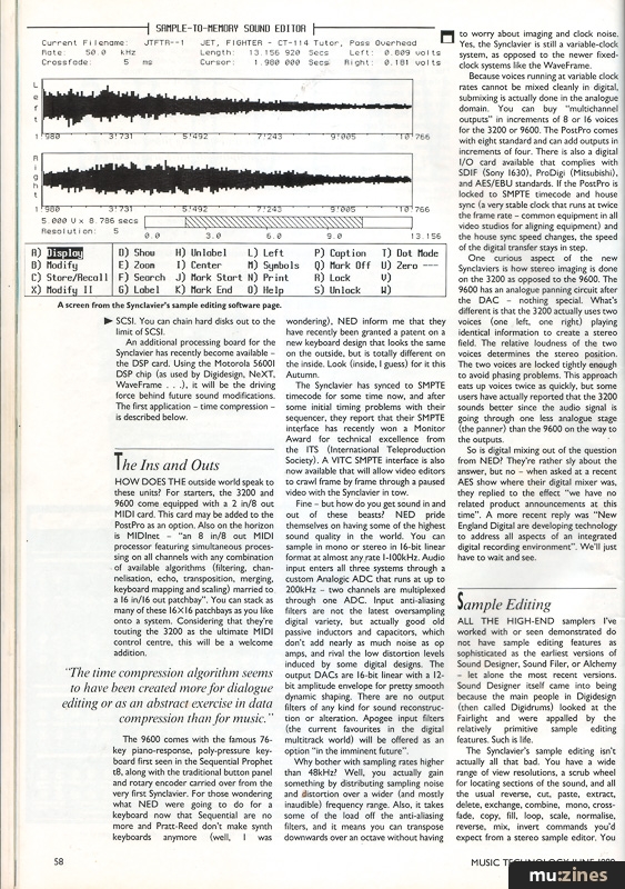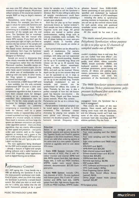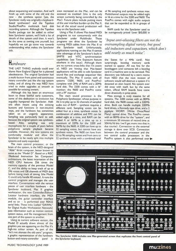 Using a Mac II allows Mac-based MIDI programs to run concurrently with the Synclavier under Multifinder. These programs can drive the Synclavier by running MIDI cables from the Mac II to the Synclavier itself. Unfortunately, applications running on the Mac II cannot take advantage of the Synclavier's built-in SMPTE and VITC synchronisation capabilities (see Time Exposure feature elsewhere in this issue). Although there are no current cross-links that I'm aware of, NED are hinting that Mac-based applications will be able to edit Synclavier sound files and exchange sequencer files eventually. The Mac II comes with all systems (3200, 9600, and PostPro) complete with 2Mb of RAM and a 20Mb hard disk. The 3200 comes with a 16" monitor; the 9600 and PostPro come with a 19" monitor.