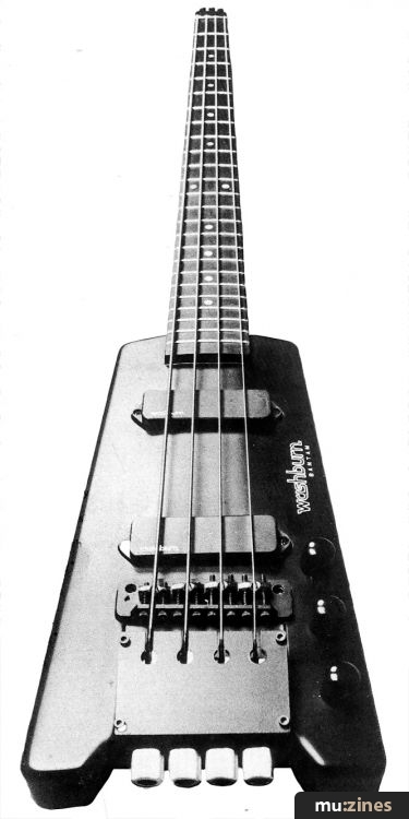 It's a topsy-turvy world — no doubts about it. At last the true Steinberger copy has landed. It's the same one you may have read about recently in a One Two oriental trade fair report, and comes complete with a padded leatherette carrying bag and a current choice of five colours. But contrary to general belief (hope?), Washburn's Bantam bass is made of wood, not moulded resin.
