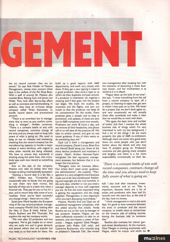 Massive, World's End and Opal are all established management companies, with the added security that entails. Vanda Rawlins set out on her own as manager of top producer Stephen Hague, yet has been sufficiently successful to take on an assistant, and now boasts a roster of four artists - Hague, engineer Dave Meegan, producer John Robie (UK only), and Catherine Buchannan, who recently sang on Jellybean's 'Sidewalk Talk'. She moved into management after studying law with the intention of becoming a music business lawyer, and her involvement is as varied as it is in-depth.
