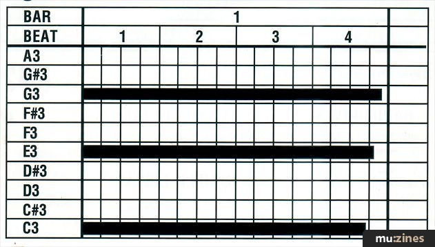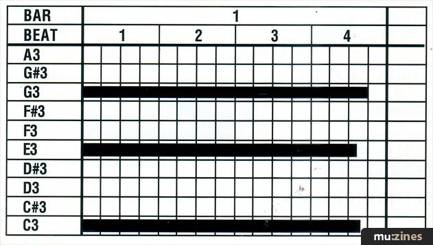 The Note Off is quantised as well: This not only changes the note length but as each Note Off will be moved differently, it does so in an inconsistent way (Figure 5). For chords, this is rarely used, but for a solo it might be useful. If the intention was to play the solo in a legato manner (where each Note Off is butted up to the next Note On), then this type of quantisation will produce the required result. Unfortunately, the same quantise value is usually used for Note On and Off so unless the part has been played in accurately, the Note Off quantise is unlikely to produce correct legato - some Notes Off will be quantised to the wrong position.