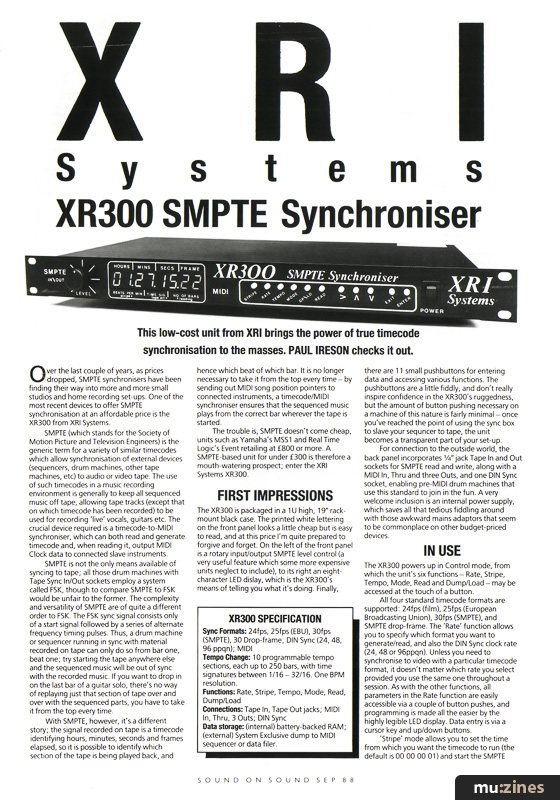 Over the last couple of years, as prices dropped, SMPTE synchronisers have been finding their way into more and more small studios and home recording set-ups. One of the most recent devices to offer SMPTE synchronisation at an affordable price is the XR300 from XRI Systems.