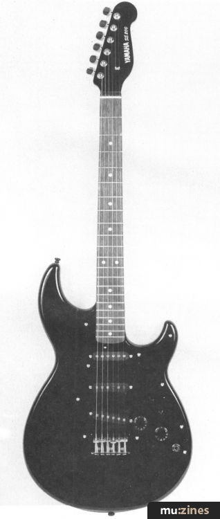 Yamaha have gone for the more standard Fender layout for the electronics with the three single coil pickups and master volume, and tone controls for the neck and middle pickups only. The single coil pickups have staggered non-adjustable poles and alnico magnets — very vintage. The control knobs are chromed, dome and knurled metal jobs and this time a proper arched 5-way toggle is fitted which is much more satisfactory than on the 200. The jack socket is on the side of the guitar and all the other gubbins is mounted on a three ply-white/black/white laminate-scratchplate. With its metallic red finish the 300 certainly looks a good deal smarter than the rather dowdy 200 and, sounds apart, the differences warrant more than a £40 price gap.