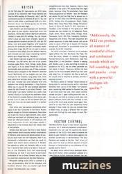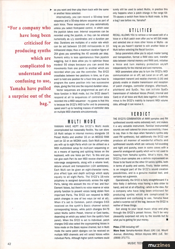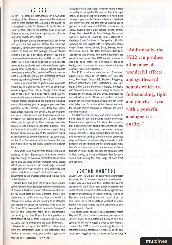 THE SY22'S COMBINATION of AWM samples and FM synthesised sounds works extremely well, and makes it a very versatile instrument. Familiar instrumental sounds are well catered for (more successfully, I have to say, than in the days when Yamaha's synths only used FM synthesis), but additionally the SY22 can produce all manner of wonderful effects and synthesised sounds which are variously full-sounding and tight and punchy, even in some cases with a powerful analogue-ish quality which we're not used to hearing from Yamaha synths. What's more, the SY22's drum samples are a definite improvement on those to be found on the other SY-series synths, both in terms of quality and variety. Finally, Vector control is an integral part of the SY22's sound creation possibilities, and is a genuine musical tool, and certainly not a gimmick.