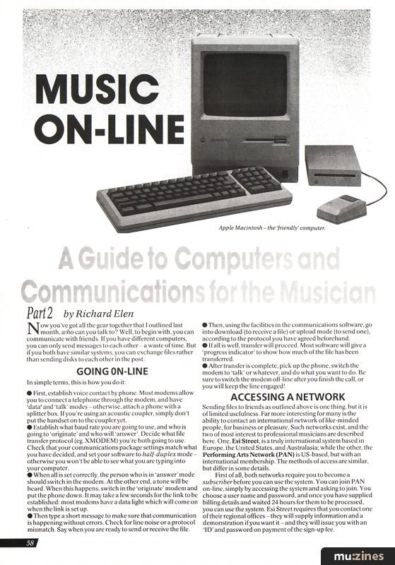 Part 2. Richard Elen concludes his guide to computers and communications for musicians with details of how to join and log on to two musicians' networks: PAN and Esi Street. There's also an extensive glossary of terms to help newcomers to this exciting field understand what it is all about.
