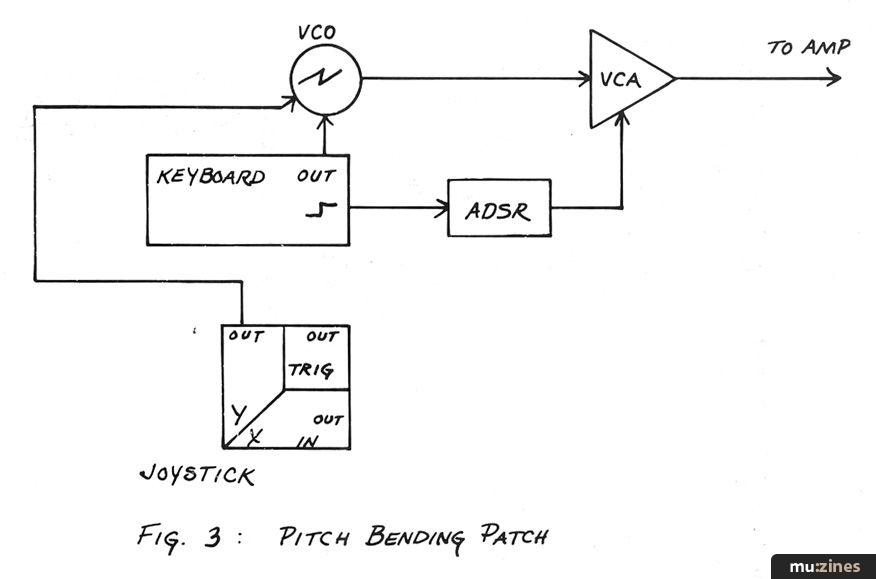 One of the first things that comes to mind when you set a knob, lever, or thumbwheel next to a keyboard is pitch bending. Since you will be bending the pitch up and down, it makes sense to use the "Y" (vertical) axis for this application. First, MAKE SURE that you have a patch cord connected from the Joystick GROUND jack to a ground jack on your 4761 Wing (or to the chassis of the unit to be controlled, if it is from another system). The Y output should be patched into the VCO(s) to be controlled IN ADDITION TO the normal control voltage from the keyboard, sequencer, etc. (See Figure 3). The front panel Y RANGE should be set to minimum. We do not want any control voltage at the output when the Joystick is at its resting center position, so the Y BIAS should be set to approximate mid-position. While inserting and removing the patchcord from the output jack, make slight adjustments to the Y BIAS control until there is NO pitch offset when the Joystick is connected to the VCO. This is the point where there is 0 volts bias at the Joystick output. If you can get close with the BIAS control, then you can fine tune the zero setting with the Joystick trimmers. Now, you should be able to play up and down your keyboard and selectively add upwards or downwards pitch bends of up to a musical fifth or so. If you prefer more dramatic, wide-range pitch sweeps, the RANGE control can be advanced as desired. NOTE, though, that the BIAS, control will need to be reset to provide the initial 0 volt output.