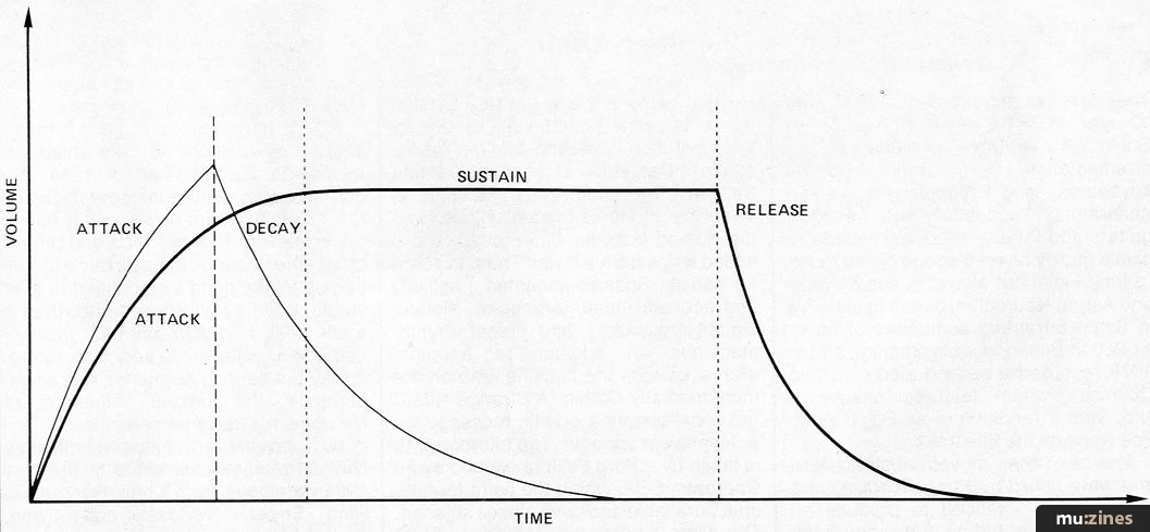The simplest contour available is shown in Fig 1. At the start of the sound the volume rises fairly sharply with time, but soon reaches a peak, and the sound then immediately starts to die away. Usually the decay will last many tens of times longer than the attack.
