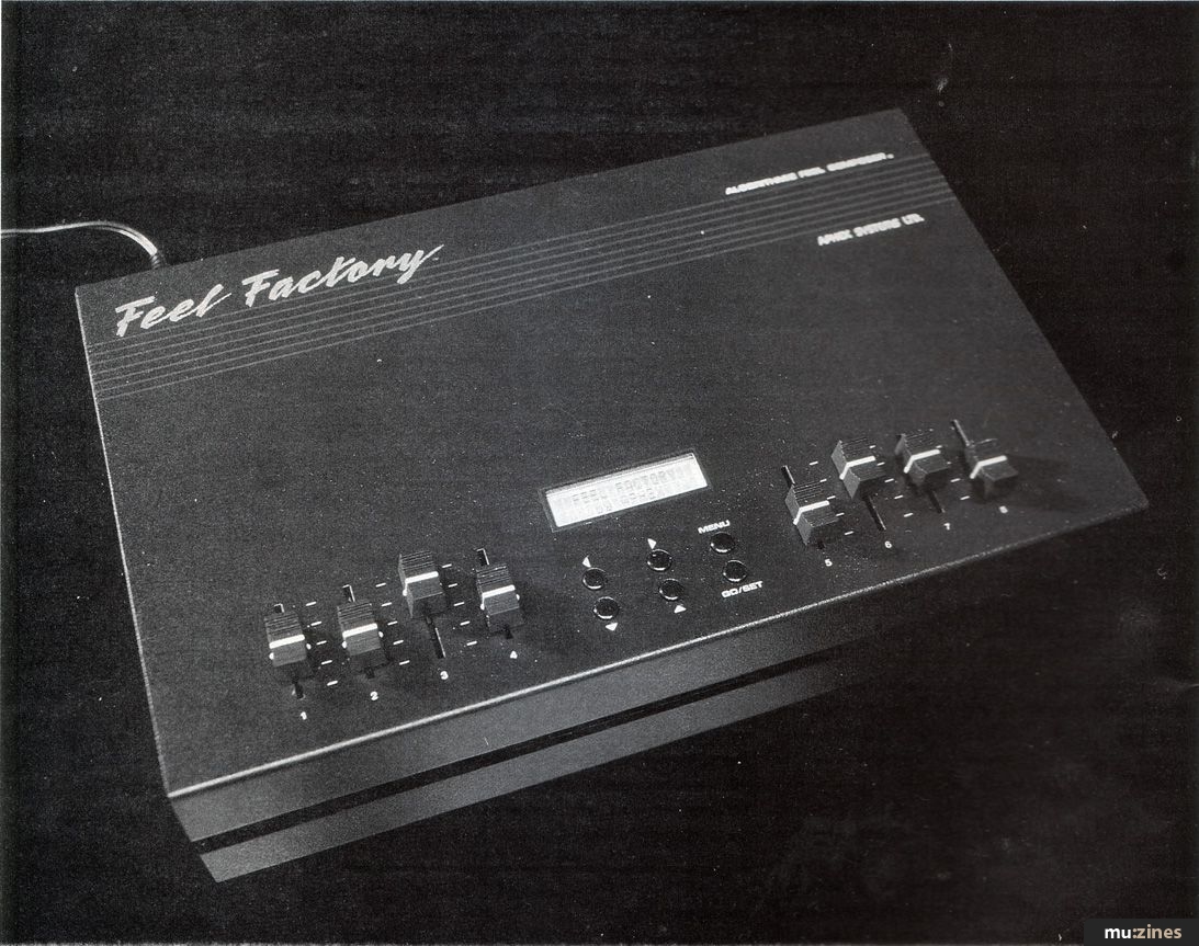 SO WE TURN from theory to practice. Feel Factory is a flat metal box designed to sit on a table top, with eight short sliders, six programming buttons and a backlit 32-character LCD. The rear panel of the box holds all the communications connections: One MIDI In, four MIDI Outs, SMPTE in and out, MIDI clock out, Macintosh serial interface, power switch and 9V power input. There are also two extra ports labelled Mac data and MIDI data that are "reserved for future Feel Factory products".
