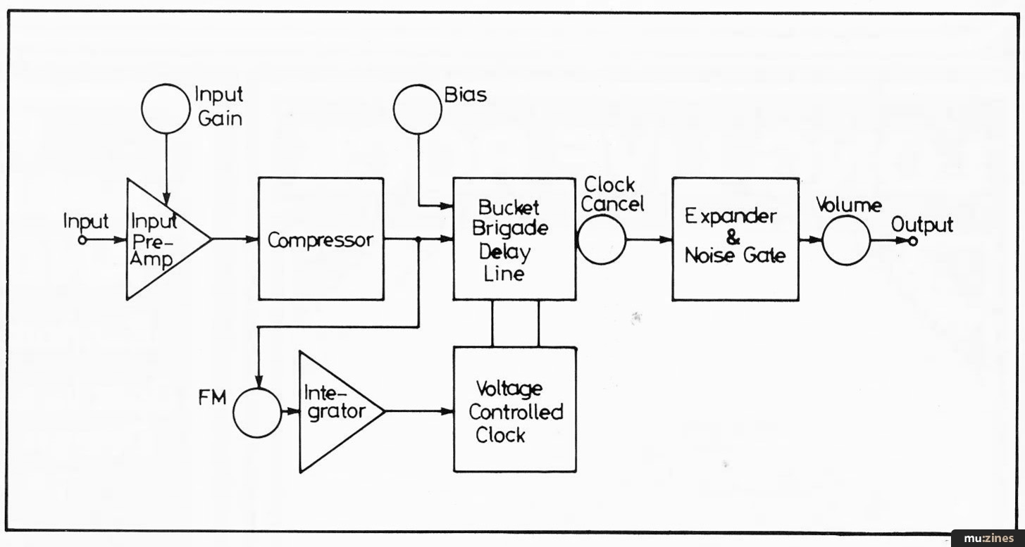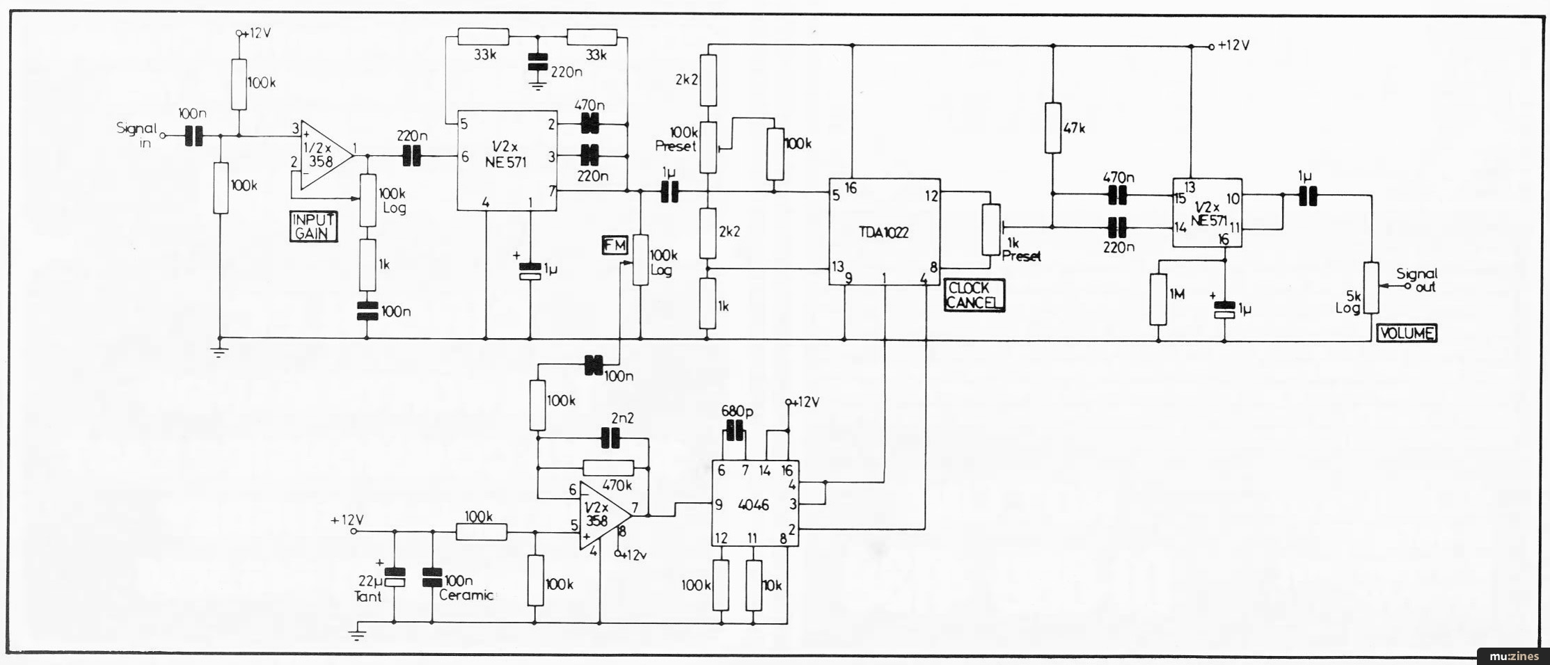 This circuit is, of course, wide open to further experimentation, particularly by varying the modulating signal. By disconnecting the top end of the 'FM' pot from pin 7 of the NE 571 compressor, other signals can be used for modulation - for example: the uncompressed input, taken after the input preamp; the delay-line output; the expanded output; or even another separate external signal (eg. oscillator, noise generator, harmoniser etc). A Low Frequency Oscillator could be connected via, say, a 220k resistor to pin 6 of the LM358 (the integrator input) to allow the tone of the FM to be subtly varied with time or, with the FM turned down, to allow real-time vibrato to be added to the input signal.