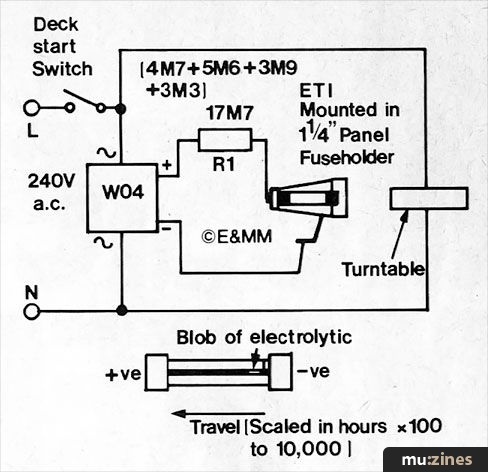 In the application circuit above, the device is intended to act as a guide to timing stylus replacement, thus it's connected across the turntable's mains supply. The bridge rectifier (BR) provides the requisite DC voltage, and R1 sets the current for a 500hr FSD. Once this period has elapsed, the fuse-like ETI is simply removed from its enclosure (a standard ¼" fuseholder) and turned around, the inversion of polarity causing the electrolyte blob to set course on another 500hr trek.