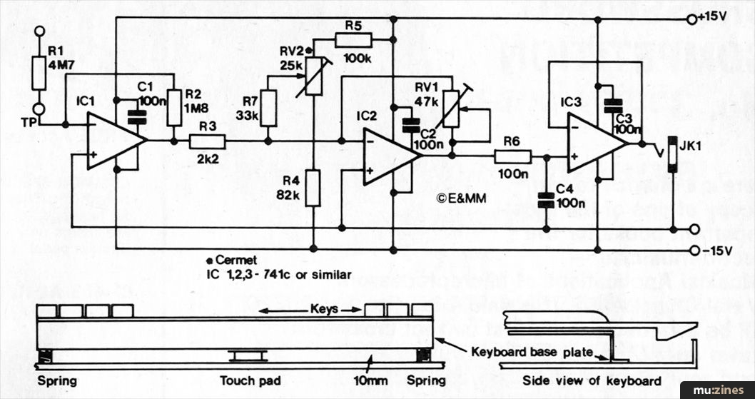 Electronic keyboard instruments often have some form of dynamic or touch sensitivity added in order to allow the player more expressiveness. The circuit shown here enables touch sensitivity to be added to most keyboards without the need to modify the keyboard contacts or the keyboard itself. The circuit makes use of a pressure sensitive pad placed underneath the keyboard rest. Under normal playing conditions, the circuit is adjusted so that the output voltage is zero. However, if during 'normal' fingering additional pressure is applied to the keys, then a variable output voltage is generated by the circuit, the value of which is dependent upon the pressure applied.