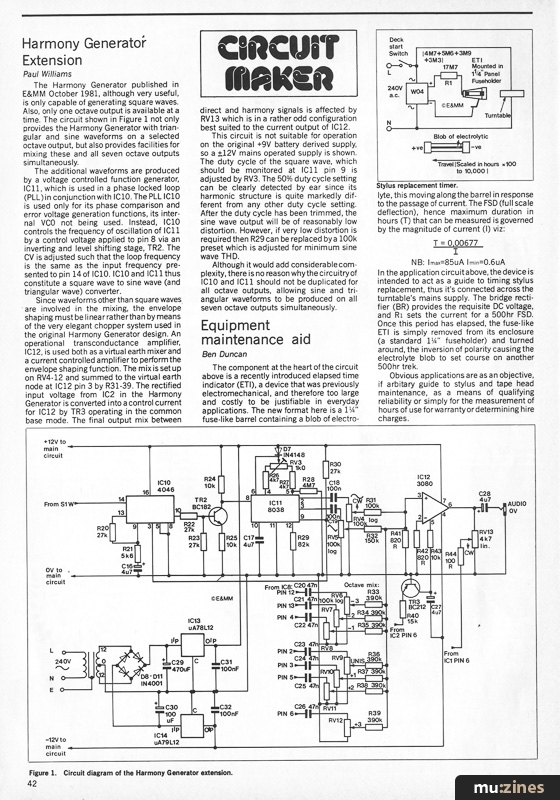 The Harmony Generator published in E&MM October 1981, although very useful, is only capable of generating square waves. Also, only one octave output is available at a time. The circuit shown in Figure 1 not only provides the Harmony Generator with triangular and sine waveforms on a selected octave output, but also provides facilities for mixing these and all seven octave outputs simultaneously.