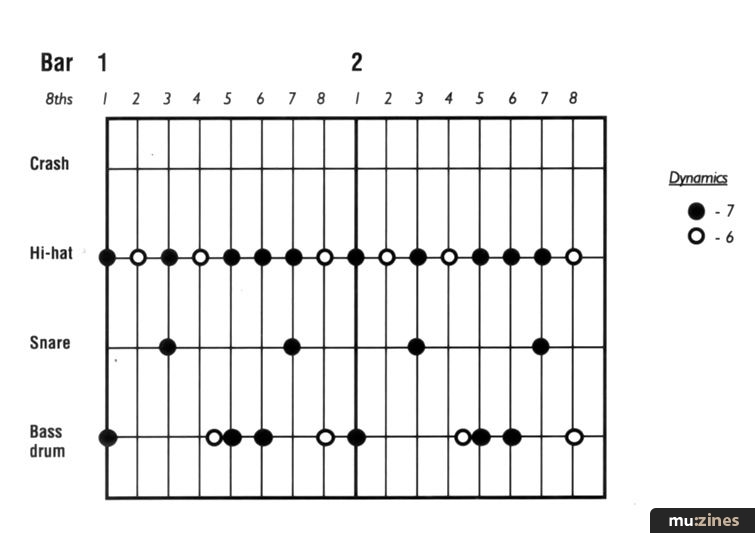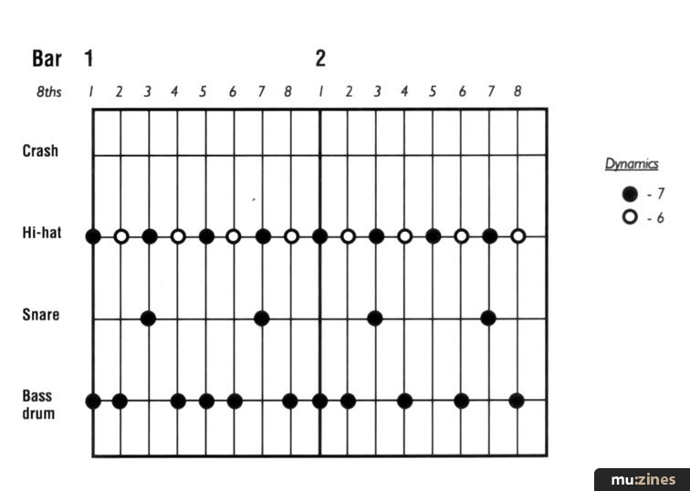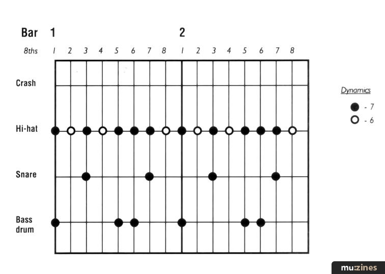 You needn't worry that certain bass drum figures will appear too flat — it's strange but the ear tends to supply the illusion of dynamics once a bass part is added. The dynamics of your bass guitar/keyboard line sympathetically affects the relationship between how you hear the drums and what's actually there. If you have a drum pattern (see Figure 4) running with all of the bass drum beats playing at a dynamic level of 7, you'll hear the individual beats in different ways depending on what your accompanying bass line is doing — change the bass line and you'll hear the kick drum differently. The exact same kick drum beat is perceived differently if it's heard against a note pitched higher, and different yet again if heard against a lower one, it's quieter if juxtaposed against a louder bass note, and stands out more when the bass note is softer.