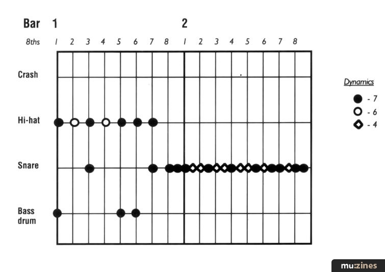 If your drum machine's memory limits its internal dynamic settings to a range of eight levels (a common practice), then select level 7 as your standard, working level. "Why not use level 6? I might want to go two levels louder for certain beats..." In theory, this idea is fine. In practice, it doesn't quite work out that way. The problem is that those eight levels are simply too coarse — the difference in volume between one level and the next is just too great to use more than one at a time. If you set up a rhythm using a dynamic level of 6, and then make accents at level 7, I'm sure you'd find them sufficiently loud. In fact, you might even be wondering if it was too much... if you used accents two dynamic levels louder they'd jump right out of the mix. Therefore, if you can only go 'one louder', you may as well use level 7 as your 'root'.