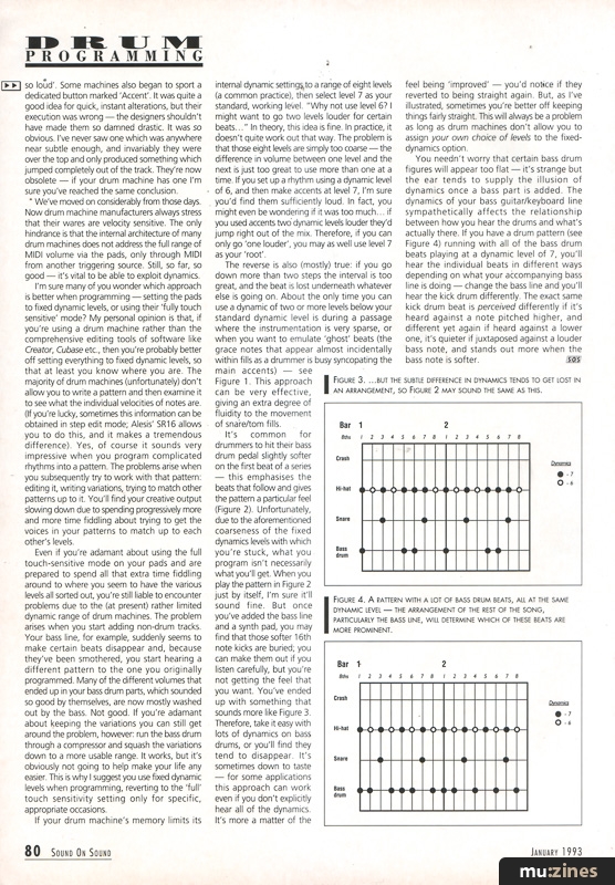 We've moved on considerably from those days. Now drum machine manufacturers always stress that their wares are velocity sensitive. The only hindrance is that the internal architecture of many drum machines does not address the full range of MIDI volume via the pads, only through MIDI from another triggering source. Still, so far, so good — it's vital to be able to exploit dynamics.