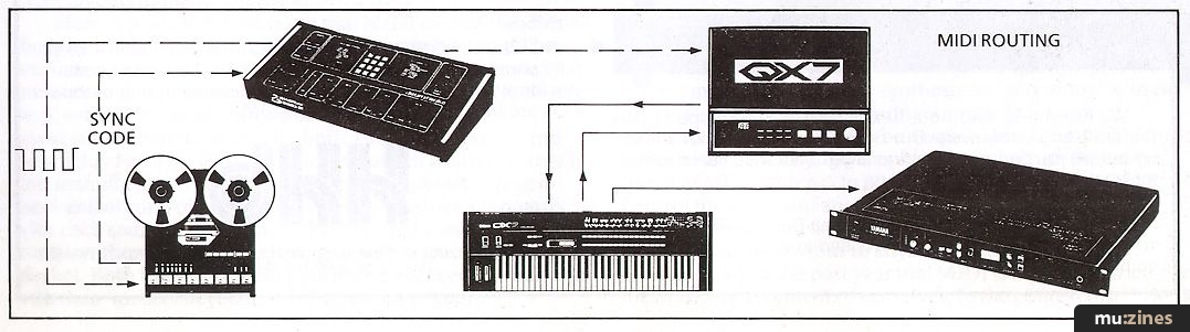 Unfortunately, you can't sync the QX7 to tape as the MIDI In is being used to record voice program change data from the keyboard. So, what you have to do is record the sync code from the drum machine on tape along with any other instruments first and then rewind the tape. Set the QX7 in real-time record mode and then start the tape machine and sequencer simultaneously by hand. Admittedly, it's not the most satisfactory method but it's the only way this particular set-up will work. Creativity comes first you know!