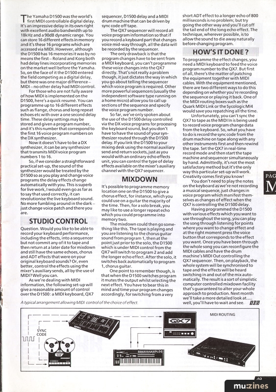 Question. Would you like to be able to record your keyboard performance, including the effects, into a sequencer but not commit any of it to tape and then return at a later date for mixdown and still have the same echoes, chorus and ADT effects that were on your original keyboard sounds? Or, even better, control the effects using the mixer's auxiliary sends, all by the use of MIDI? Well you can.