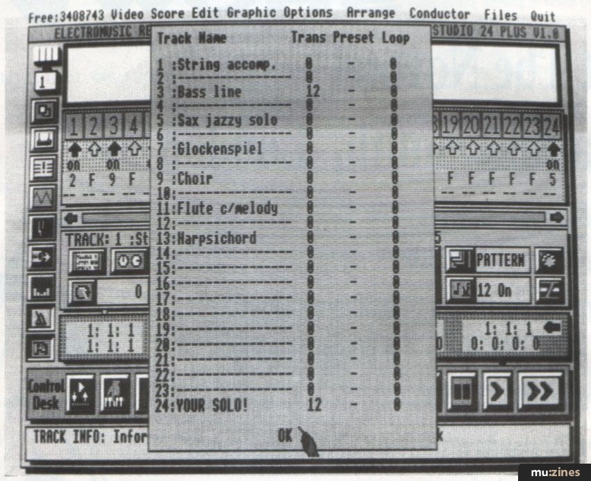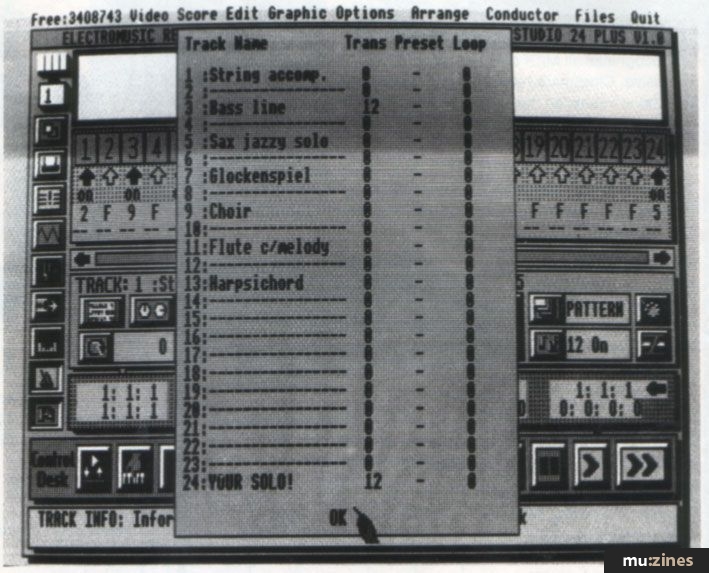 When you load the program you're asked to allocate memory for the Waveform Filing System which holds the internal sounds. In theory you can access 32 sounds but this figure is dependent upon the amount of memory you allocate to the WFS. EMR have also produced a SoundSynth program for creating and editing the internal sounds plus several Sound Creation disks containing sound samples and these can be loaded into Studio 24.