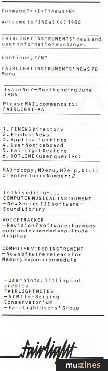 Fairlight chose to do the majority of their on-line support via the Esi network, and have a 'hotline' electronic mailbox on the system where users can deposit any queries, and a regular electronic publication, 'FiNews', which gives up-to-date information on the world of Fairlight Instruments. The following is an extract: