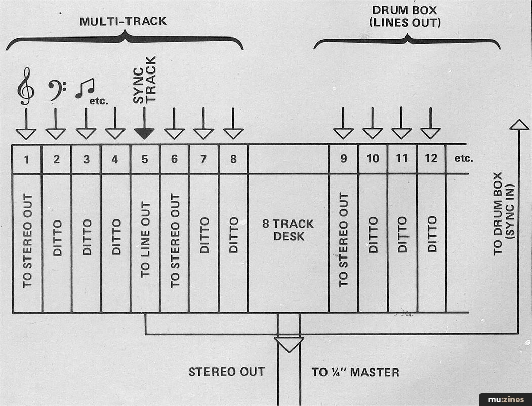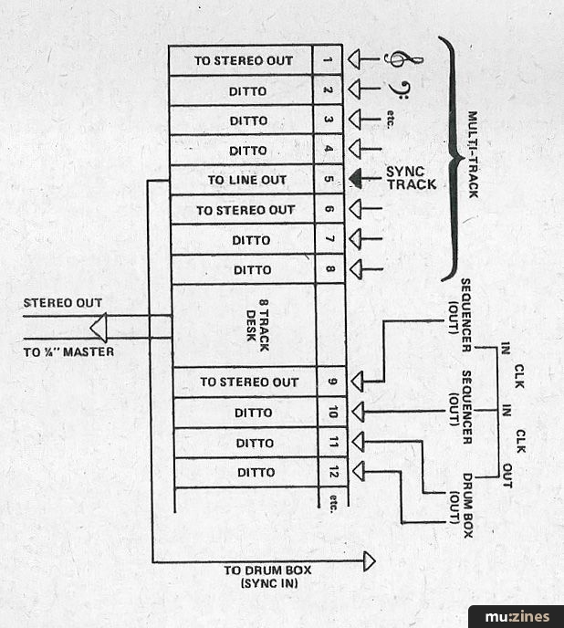 Craig Bevan, who mixes for the B-Boys and The VHB, does all his work on 8-track! This is basically made possible by the Sync Track Technique, which in effect enables him to achieve something close to a 16 or 20 track sound using only an 8-track recorder. The basic method for setting up a sync track is this: