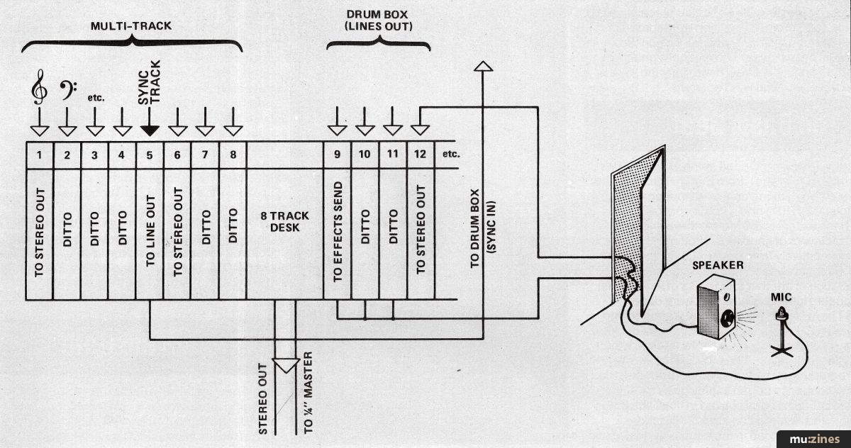 This is easily done with a Linn, DMX, Drumulator or Roland TR909 by taking a line from the Sync Out port into the desk. Unfortunately, on cheaper units like the TR808 etc you will need to purchase a sync-to-tape unit for this purpose. Having recorded the sync track, change the line in the Sync Out port to Sync In. Now the tape can drive your drum program on the drum machine while you put the other tracks on the remaining seven channels (the sync track is muted). The drum machine is monitored via the other Line Ins on the desk but never recorded on the multitrack.