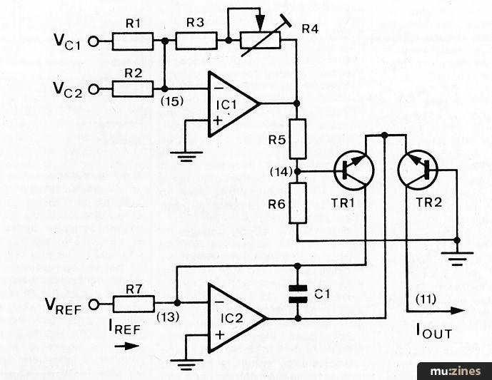 Before discussing selection of component values there are a number of features of the CEM 3330 which should be noted. First, that both the signal inputs, pins 4(13), and the linear control inputs, pins 7(12), are summing nodes which allows any number of signal and linear control voltages to be mixed within the IC. Next that the current output should be converted to a voltage using an op amp configured as a current-to-voltage converter (Figure 5) and use Ohm's Law, V = IxRF, to calculate the voltage. The op amp should be a low noise high slew rate type such as LF351 or NE5534. Third, referring to Figure 4 one sees that pin 8 is labelled 'Idle Adjust' and one of the novel features of the CEM 3330 is the ability to alter the quiescent standby current of the signal carrying resistors and hence the operation of the gain cells between Class A (say, 100uA) and Class B (say, 1uA). The choice depends on the application and in general terms operating at high standby current will increase slew rate, increase available output current and decrease distortion but at the expense of increased noise and control voltage feedthrough. For typical VCA synthesiser application one would compromise and choose an operating point of about Class AB (about 7uA standby current) which would be achieved with a 6k8 resistor between pins 8 and 5.