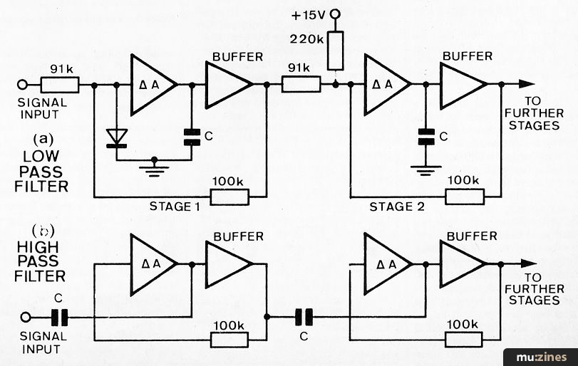 Hopefully it will now be obvious that if the input signal contains a DC component then the low pass filter should be capacitor coupled at its input to avoid upsetting the desirable current conditions and raising the voltage at the buffer output. A band pass filter is not illustrated since this may be configured simply by using two stages of high pass followed by two stages of low pass, the latter being as Stage 2 of Figure 3a. A capacitor of 270pF will be satisfactory for these circuits.