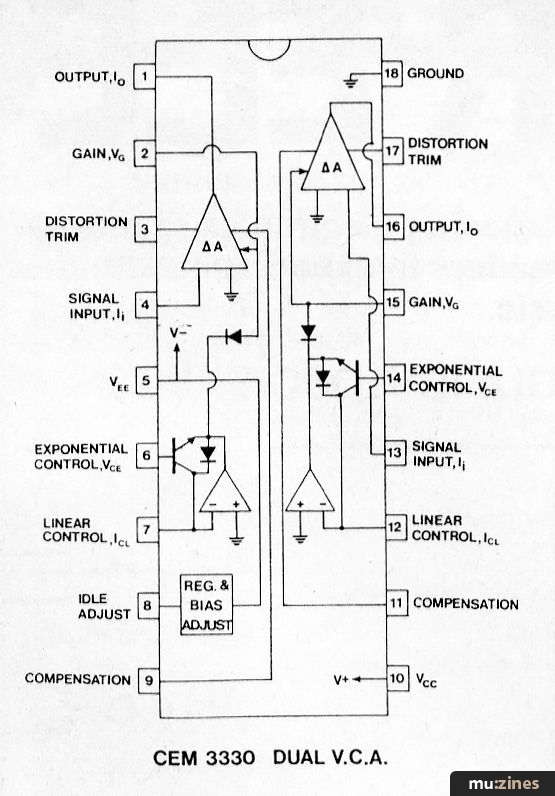 Figure 4 illustrates the functional block diagram of the CEM 3330 and some of the features previously discussed are evident. The variable gain cell is a current-in, current-out type and provision is made for both linear and exponential control of gain. Since there are two VCA's in the package we will often have to give two pin numbers during the discussion and the pin numbers for the second VCA are given in brackets. Linear inputs, pins 7(12), are accepted as currents, ICL, and the on-chip log converter generates the logarithm of this current while exponential control inputs, VCE at pins 6(14), are transmitted unchanged to the gain cell.