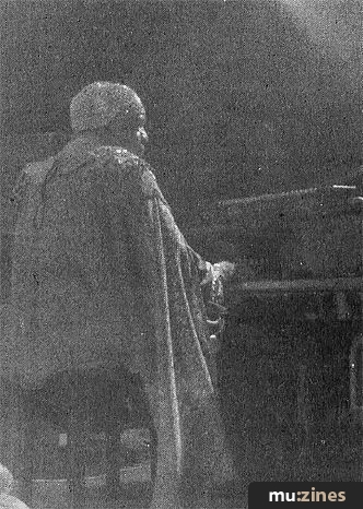 Ra's approach has always been electric, and the Venue concert covered almost all the styles he's been known to use on record. In other words — the opening was confusing, a morass of African percussion, tuneless trumpet solos and strange lilting vocals. The second phase was more accessible — powerful jazz with forceful-rhythms building up to the introduction of Ra himself, who proceeded to dominate the stage despite the presence of the whole Arkestra. Finally Ra sidled over to the piano and proceeded to blast out a series of blues and jazz riffs interspersed with an almost Big Band style from the other players, showing all the expression which convinced him that synthesizers have to be combined with acoustic instruments. Ra's only other keyboard on the night was a Crumar Synthaphone, which in addition to allowing keyboard control can have a breath input from a plastic tube plugged into the side panel — a sort of intermediate technology Yamaha CS-01.