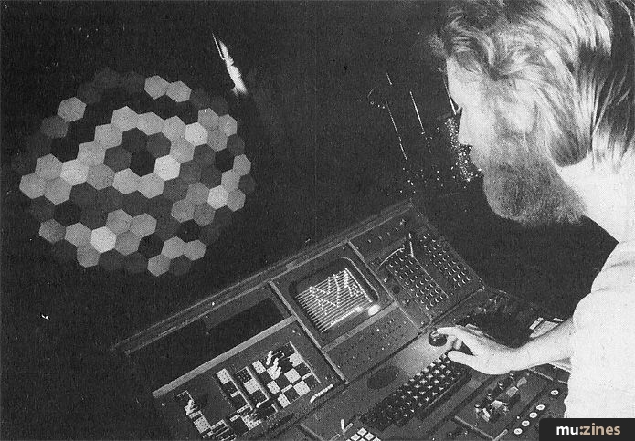 The light synthesizer, colloquially known as Christine Pristine Aurora, consists of a control unit designed by Toby Holland connected by multicore to 256 thyristors controlling sets of red, green and blue hand-tinted bulbs. Each 'cell' of the display is capable of producing any colour in the same way a TV screen does, with control over every cell by the built-in 8085 computer. Several analogue devices such as sequencers and routing patchbays serve to define the exact patterns appearing on the screen; it's difficult to describe the exact nature of the display, but "lava flows pulsating, waves scintillating on oceanic worlds, debris drifting in space and tesselated patterns taking shape" comes somewhere close! The music, although partly improvised, matches perfectly with the visuals, building to a climax and then settling back to the sedate pace of the opening.