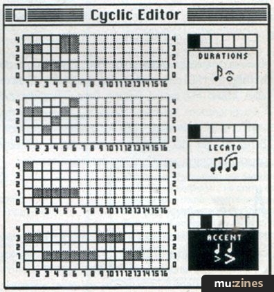 The sequential order in which notes are played back may be altered with a variety of options, tempo dividers are available to offset the relative timebase of one Pattern to another, and Patterns may be transposed independently. The MIDI channel routing and sound programs used by each Pattern may be changed instantly, and dynamic ranges and note densities for each Pattern may be altered at will. Furthermore, a unique "Cyclic Editor" can be employed to alter the duration, phrasing and accents of each Pattern with a powerful graphics-based grid system.