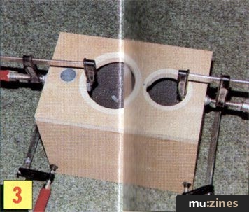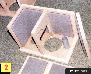 Wilmslow's flatpack cabinets are a joy to build — they're very accurately machined from MDF, complete with speaker cut-outs and rebates. The cabinet is a ported design which comes as six panels plus an internal bracing member, and the first step is to glue the plastic port pipes into their front panel cutouts. Next, the supplied self-adhesive damping panels are cut to size and fixed to the inside surfaces of the panels. All you have to do then is to apply PVA wood glue to the joints and tape the whole assembly together with masking tape until the glue dries. Excess glue can be wiped off with a damp cloth as long as you catch it before it dries.