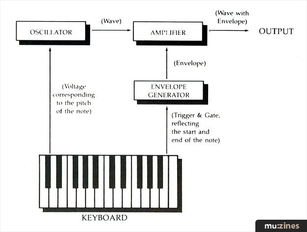 The keyboard itself often consisted of a simple resistive chain (thereby producing the changing voltage), and a detection circuit which noticed each time a voltage was present and provided a trigger (normally called a Gate) pulse to the Envelope Generators. On most monosynths, input sockets were provided to allow sequencers to join the keyboard output - referred to as Gate In and Control Voltage In. The famous Jean-Michel Jarre sequences heard on Oxygene were produced by a simple sequencer providing an 8-note pattern of voltages and gate pulses, which were then fed to a synthesizer. Using the synth keyboard, an adjusting voltage could be applied which allowed the overall pitch to be varied so that you could effectively transpose the sequence up and down.