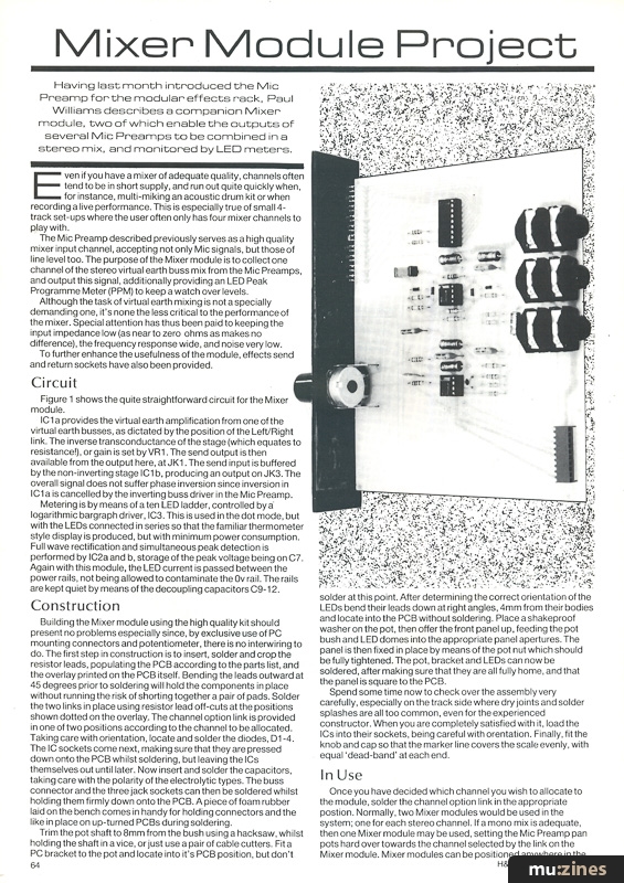 Having last month introduced the Mic Preamp for the modular effects rack, Paul Williams describes a companion Mixer module, two of which enable the outputs of several Mic Preamps to be combined in a stereo mix, and monitored by LED meters.