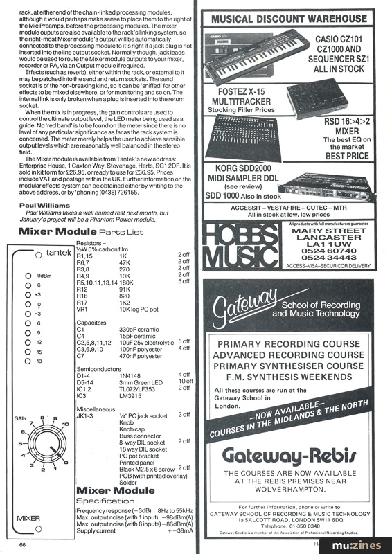 The Mixer module is available from Tantek's new address: (Contact Details). It is sold in kit form for £26.95, or ready to use for £36.95. Prices include VAT and postage within the UK. Further information on the modular effects system can be obtained either by writing to the above address, or by 'phoning (Contact Details).