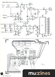 Metering is by means of a ten LED ladder, controlled by a logarithmic bargraph driver, IC3. This is used in the dot mode, but with the LEDs connected in series so that the familiar thermometer style display is produced, but with minimum power consumption. Full wave rectification and simultaneous peak detection is performed by IC2a and b, storage of the peak voltage being on C7. Again with this module, the LED current is passed between the power rails, not being allowed to contaminate the 0v rail. The rails are kept quiet by means of the decoupling capacitors C9-12.