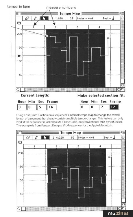 This has three major advantages. First, setting up tempo changes in a computer-based sequencer is much easier than doing it on a device like an SBX80. Most good sequencers let you perform tempo tricks like create smooth accelerandos and ritards, or fit a certain number of beats into a certain length of time, or create a complex tempo and beat pattern that runs over several bars and repeat it many times, or even run different tracks at different tempos. When using MIDI Time Code, you can utilise all of these features, letting the computer worry about making sure the numbers are exactly right. With an external synchroniser sending MIDI clocks, performing those same functions requires a calculator, a click book, and a lot of patience, if you can do them at all. (Figure 1.)