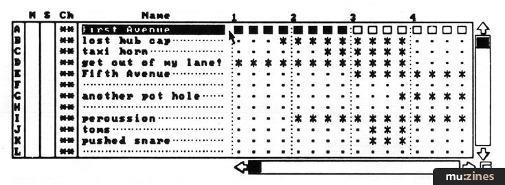 There are two distinct editing environments in Prism, as the clear but wordy manual states. Depending on how precisely you want to home in on the MIDI data, you can either edit by chunks in the Track Sheet itself, or get down to the fine detail in the Event List. The Track Sheet window displays 16 beats of music horizontally, which you can scroll quite easily to look at other parts of the composition. Stars, squares, and dots tell you what happens on each beat of each track. A star or a square means 'something happens', a dot means 'nothing on this beat'. I very much liked the way you can click the mouse on any star or square and hear what happens on that beat. The mouse also selects regions of the track display for editing. By clicking or shift-clicking the mouse on any of the track names, you can select tracks for editing. By doing the same on areas of the activity display, perhaps using the scroll bar to move around the piece, a section of music a certain number of tracks wide and a certain number of beats long is selected. Although editing by the beat is useful for a lot of operations, the section length can be adjusted quite easily by clock pulses.