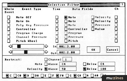 An ingenious device called the Post Operator can work wonders in transforming rough and ready MIDI data into the musical and expressive sounds you would like to hear. And by the way, you can do all this editing while the music continues to play and hear the difference it makes almost instantly. Post Operators let you change a number of selected values by adding, subtracting, multiplying, dividing, or randomising them. For instance, you can add 20 to all the velocities, multiply durations by 1.5, randomise the timing of the event by up to a specified amount. Integral to the use of Post Operators is a Selection Filter (Figure 3), which determines which events will be edited. For example, you might want to add 10 to all the velocities of notes below C3 in bars 2 and 3. The Selection Filter works with MIDI Controllers, Program Changes, and other types of data too.