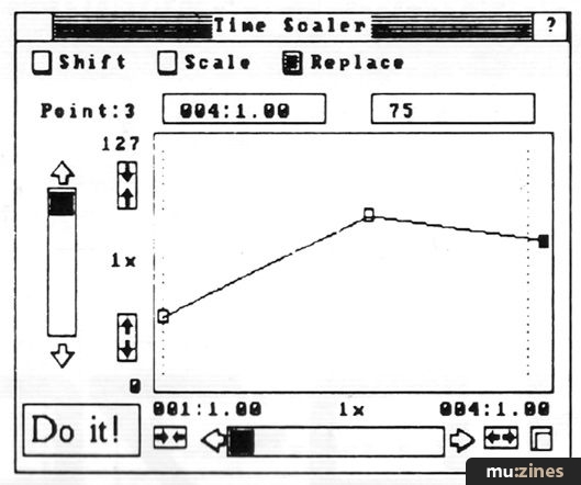 • The Time Scaler is simpler, but still powerful, and is used to draw out a graph of values which change with time, such as velocity values increasing during a crescendo. And don't forget that it can work with controllers, time shifts, and pitch transpositions too.
