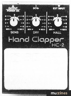 The Boss HC-2 Hand Clapper can either be used on the trigger output of a drum machine or can be struck manually by means of a pad. It gives a wide range of handclap sounds from 'dry' to 'thick'. Power is by nine volt battery or a mains adapter and the handclap unit costs £49.00 inc. VAT.