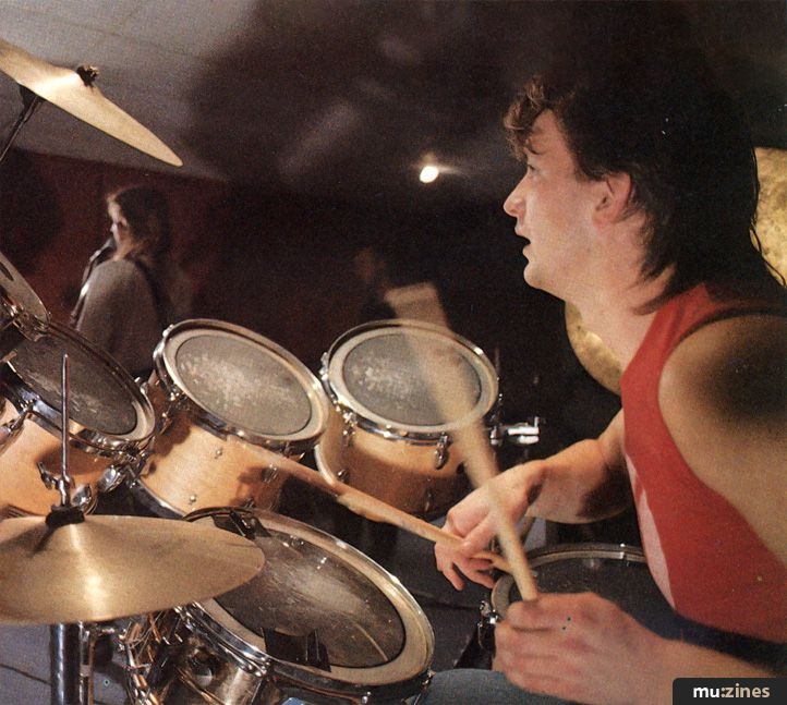 "I don't use many cymbals at all — a Zildjian crash and a Zildjian 22in swish without the rivets because they've fallen out, and the hi-hats are Zildjian New Beats which are great... strong, loud hi-hats that really cut through." And the snare? "Is the loudest snare drum in the world, though I would like to try one of the wood Gretsches."