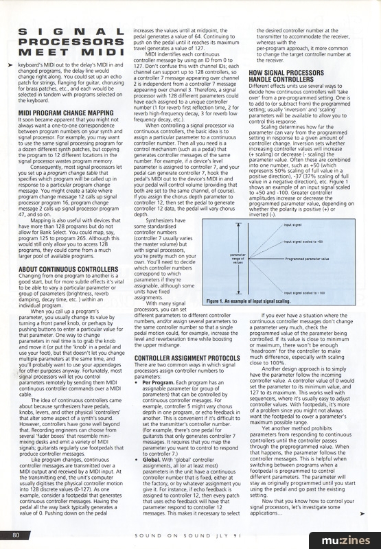 The first mass-market, MIDI-controlled signal processor was a Yamaha delay line that responded to program changes issued by a master keyboard. Thus, if you connected the keyboard's MIDI out to the delay's MIDI in and changed programs, the delay line would change right along. You could set up an echo patch for strings, flanging for guitar, chorusing for brass patches, etc., and each would be selected in tandem with programs selected on the keyboard.