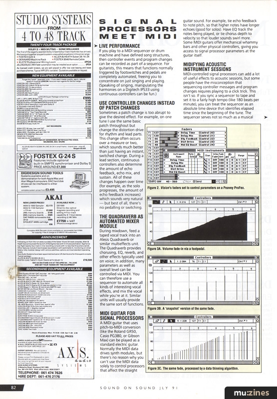 Many sequencing programs (Vision, Beyond, Performer, etc.) now include on-screen 'virtual faders' that can be assigned to various continuous controllers. If your signal processor allows for multiple parameters to be controlled with continuous controllers, mousing around with software sliders is often a lot more convenient than using the signal processor's switches and sliders since you merely have to grab an on-screen fader and move it to change a parameter. The faders will often include a readout of the value, which is very helpful in determining how your processor will respond to different controller messages.